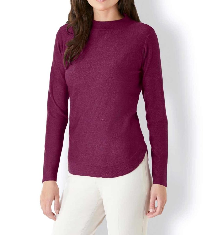 Απαλή ύφανση σε εξαιρετική ποιότητα με υψηλής αξίας συνδυασμό από Modal και βισκόζ. Μελανζέ νήματα σε επεξεργασία αριστερής πλέξης. Μοντέρνο λιτό ντεσέν με στιλάτο σηκωτό γιακά, μακριά μανίκια και στρογγυλεμένο ριπ τελείωμα. Μικρό μεταλλικό Logobadge μπροστά. Μήκος περ. 70 cm. Απαλή πλεκτή ποιότητα από 50% πολυαμίντ, 25% Modal, 25% βισκόζ.