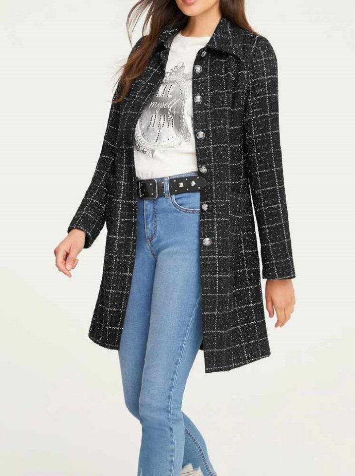Hello Beauty! Longblazer με πολυτελές εφέ! Μοντέρνο Must-Have σε καρό-ντεσέν, με γυαλιστερά νήματα-Highlights και εγχάρακτα ασημί κουμπιά. Τονίζει τη σιλουέτα. Γιακάς εσωτερικά ένθετο από δερματίνη. Επιρραμμένες τσέπες. Εν μέρει φόδρα από 100% πολυέστερ. Μήκος περ. 86 cm. Χνουδωτό υλικό με μάλλινη υφή από 100% πολυέστερ.