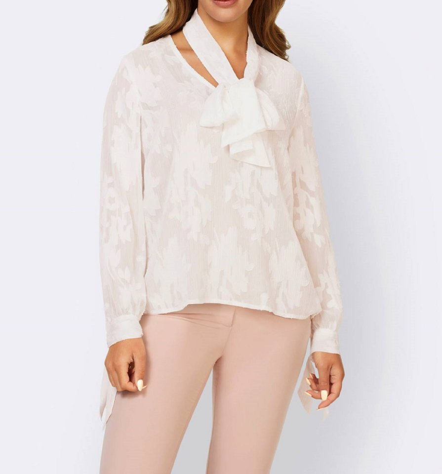 Τrendy Style και ιδιαίτερες λεπτομέρειες. Φλοράλ ντεσέν με γυαλιστερές ρίγες! Φίνα λεπτομέρεια: αφαιρούμενο, μεταβλητό μαντίλι στην V-λαιμόκοψη. Μοντέρνα μακριά μανίκια με μανσέτες που δένουν. Σε ελαφρώς διάφανη ποιότητα. Μήκος περ. 64 cm. Αεράτο υλικό από 99% πολυέστερ, 1% μεταλλιζέ ίνες.