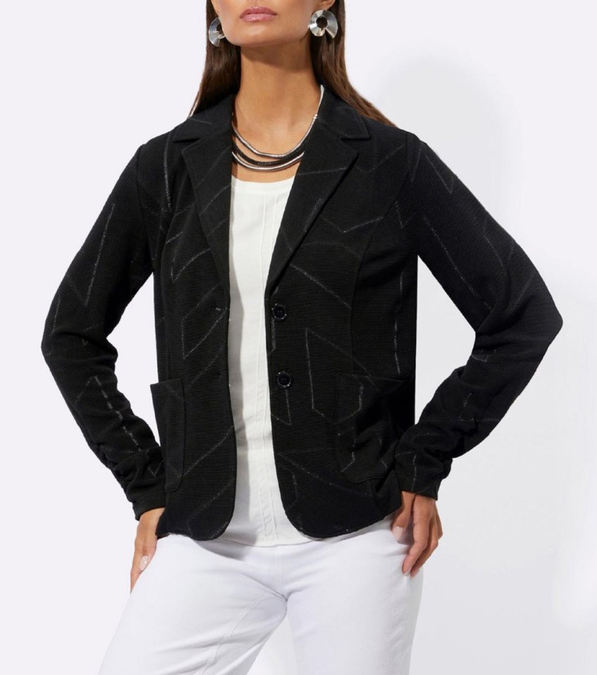 Φίνα οπτική σε άνετο Style: Μπλέιζερ σε συνδυασμό με Modal-με ελαφρώς ανάγλυφο ζακάρ ντεσέν και γυαλιστερό νήμα σε απαλή ζέρσεϊ Stretch-ποιότητα σε πλεκτή οπτική. Σούρες στα μακριά μανίκια. Ελαφρώς μεσάτο με ρεβέρ γιακά, φάσα κουμπιών και 2 επιρραμμένες τσέπες. Εσωτερικά προσεγμένη επεξεργασία με ρέλι αντίθεσης. Μήκος περ. 62 cm. 66% Modal, 25% πολυέστερ, 6% μεταλλιζέ ίνες, 3% ελασθάν.