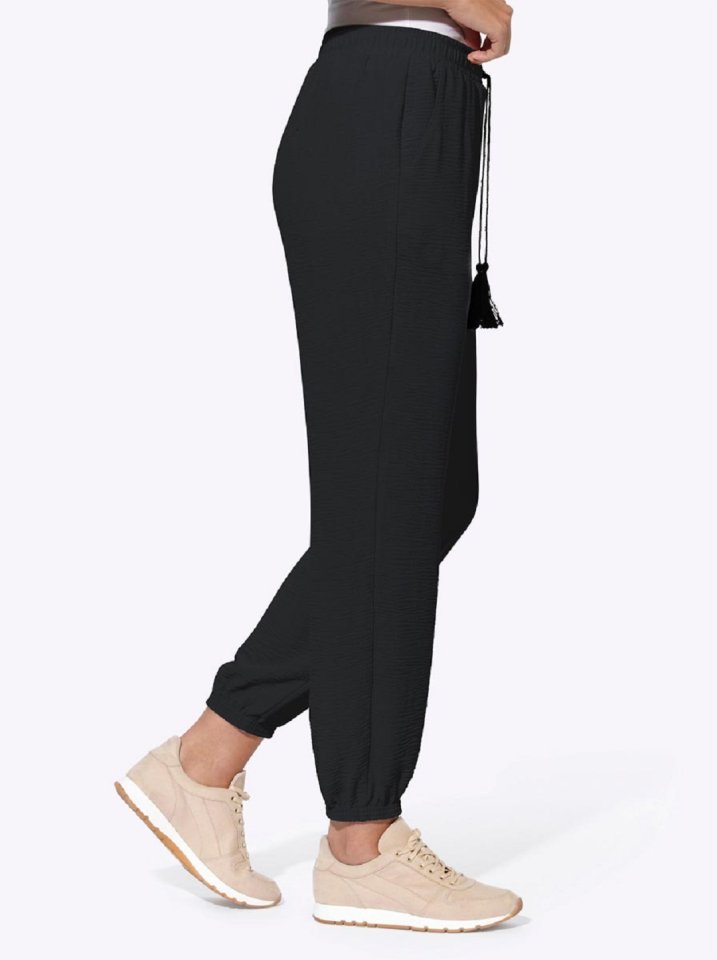 Άνεση και Style σε τέλειο μοντέρνο συνδυασμό! Παντελόνι σε Crinkle-ποιότητα. Ελαστικό ολόγυρα με κορδόνι και τσέπες. Φαρδύ μπατζάκι με ελαστικό τελείωμα. Κανονικό ύψος κορμού. Comfort fit. Φάρδος στο τελείωμα περ. 28 cm. Μήκος εσωτερικά στο μπατζάκι περ. 71 cm. Απαλή χυτή ποιότητα από 100% πολυέστερ.