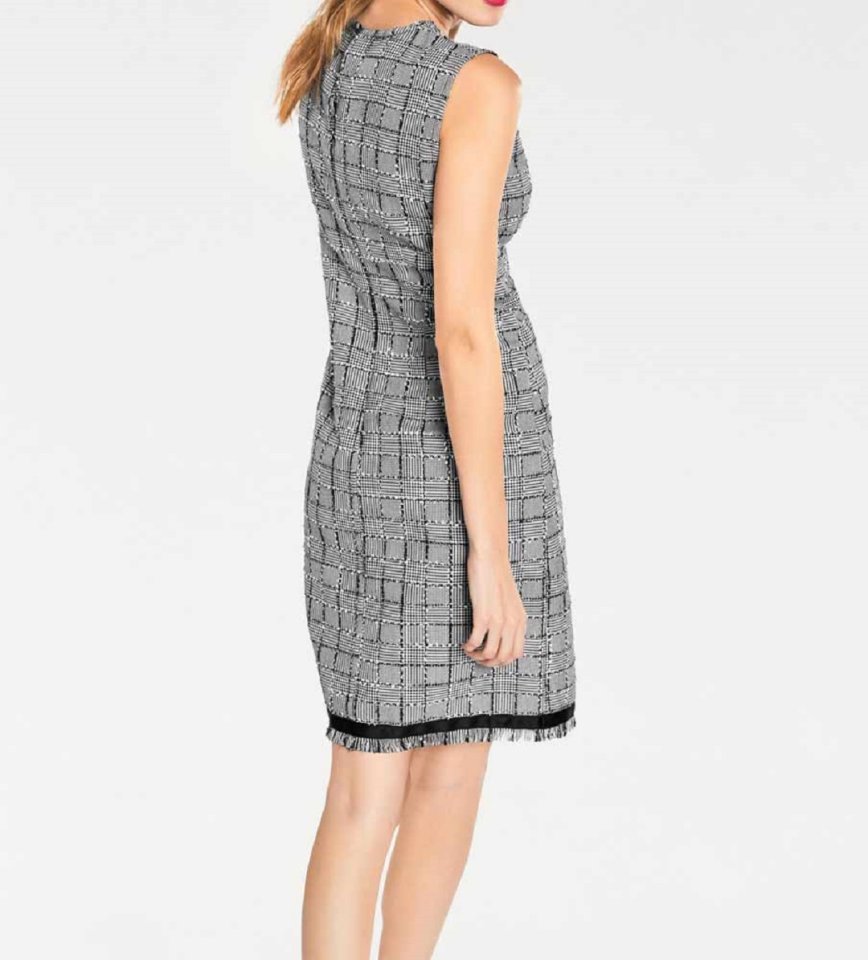 Ιδανικό για το γραφείο μέχρι και για Event. Etui φόρεμα με στενό κόψιμο με συνδυασμό από διαφορετικά καρό ντεσέν πιε ντε πουλ. Χνουδωτές 3-D-άκρες με ασημί εφέ. Κομψή, κλασική γραμμή με ένθετο αντίθεσης στο στρίφωμα με κρόσσια. Στρογγυλή λαιμόκοψη και φερμουάρ πίσω. Διαχωριστικές ραφές αναδεικνύουν τη σιλουέτα. Μήκος περ. 90 cm. Υψηλής αξίας συνδυασμός υλικών από 60% πολυέστερ, 35% βισκόζ, 5% πολυαμίντ, ένθετο από 100% πολυέστερ.
