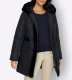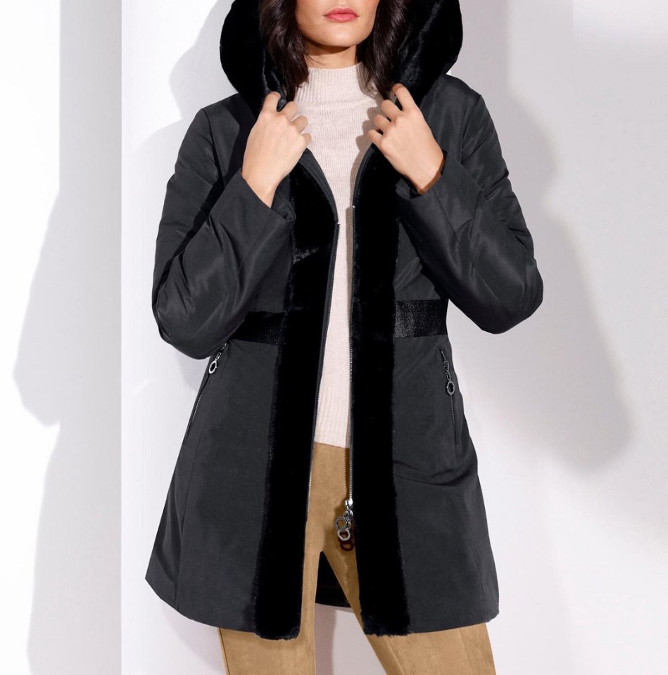 Ιδανικό κομμάτι για τον χειμώνα. Με μαλακή υφαντή γούνα στην κουκούλα και κατά μήκος στο 2-δρόμων-φερμουάρ. Φάσα στη μέση ευνοεί τη σιλουέτα. Με 2 τσέπες με φερμουάρ, εσωτερικά στο τελείωμα των μανικιών με ριπ φάσες και βιεννέζικες ραφές φορμαρίσματος. Εξαιρετικά ζεστή ποιότητα. Εξωτερικό υλικό, φόδρα, επένδυση και υφαντή γούνα από 100% πολυέστερ. Μήκος περ. 82 cm.