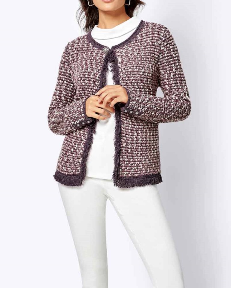 Μόδα με νότα Luxus- ζακέτα που εντυπωσιάζει με τα υπέροχα χρώματα, μπουκλέ νήμα και διακοσμητικά κρόσσια στο τελείωμα. Στρογγυλή λαιμόκοψη με κούμπωμα γαντζάκι που καλύπτεται από ένα διακοσμητικό κουμπί. Τλείωμα στο μανίκι με σχίσιμο, φάσα κουμπιών με διακοσμητικά κουμπιά. Απαλή πλεκτή ποιότητα από 48% πολυακρύλ, 25% μαλλί, 20% πολυέστερ, 7% πολυαμίντ. Μήκος περ. 60 cm