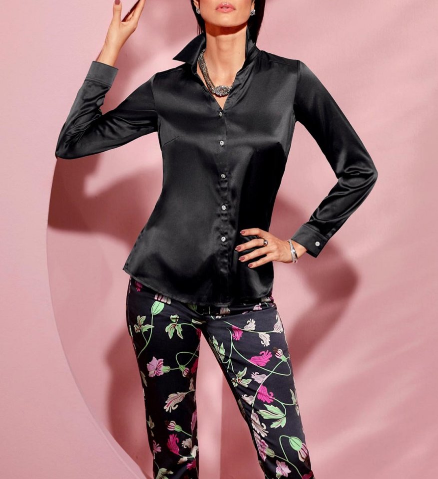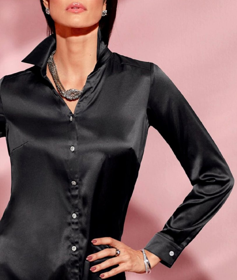 Κομψή γυαλιστερή πουκαμίσα με ανοιχτό γιακά και V-λαιμόκοψη. Διακοσμητικά κουμπιά κατά μήκος της φάσας κουμπιών με γυαλιστερές πέτρες. Πιέτα στην πλάτη προσδίδει άνετο φάρδος. Μακριά μανίκια με μανσέτες με κουμπί. Ελαφρώς στρογγυλεμένο στρίφωμα. Μήκος περ. 64 cm. Απαλό χυτό σατέν από 97% πολυέστερ, 3% ελασθάν.