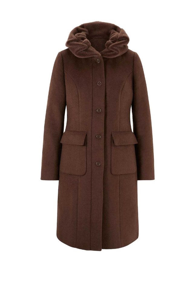 Με υψηλή περιεκτικότητα σε μαλλί και μοντέρνο ντραπέ πλούσιο γιακά με απαλή υφαντή γούνα. Ελαφρώς μεσάτο, με τσέπες με πατ και ζωνάκι πίσω. Καλυμμένο φερμουάρ με επιπλέον φάσα κουμπιών. Μήκος περ. 96 cm. Ζεστή ποιότητα από 70% πουέστερ, 30% μαλλί. Υφαντή γούνα από 100% πολυέστερ. Φόδρα από 100% πολυέστερ.